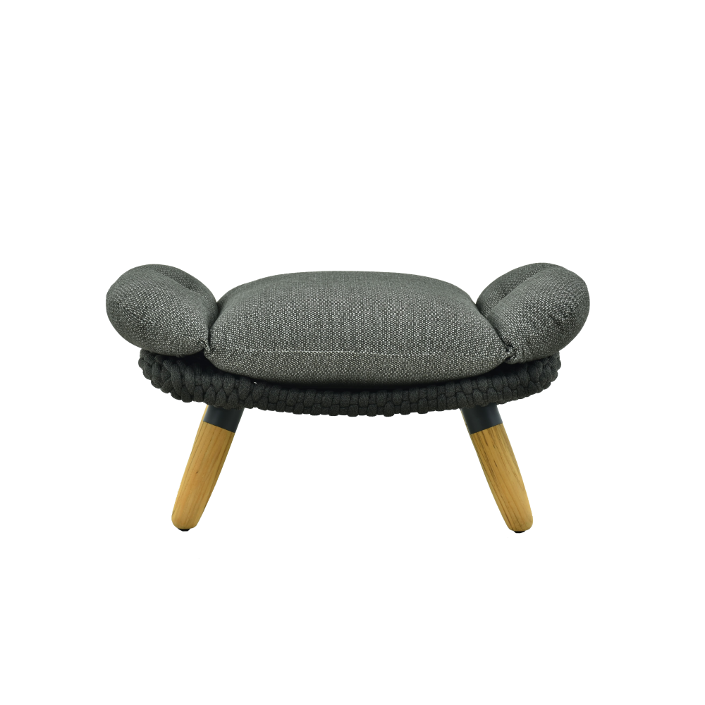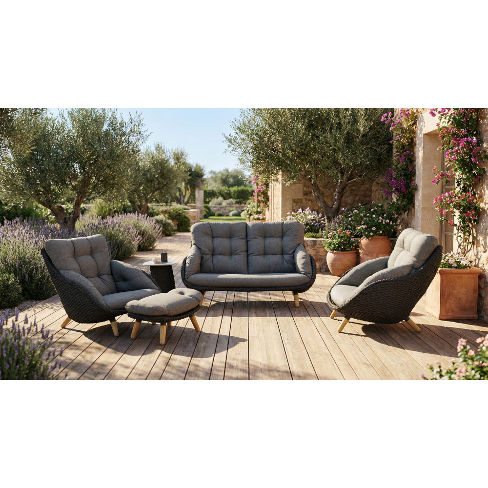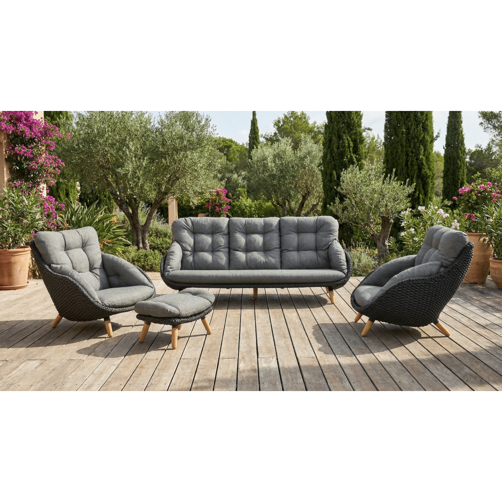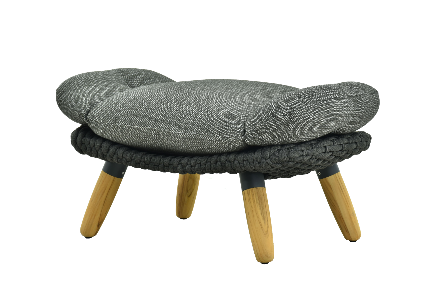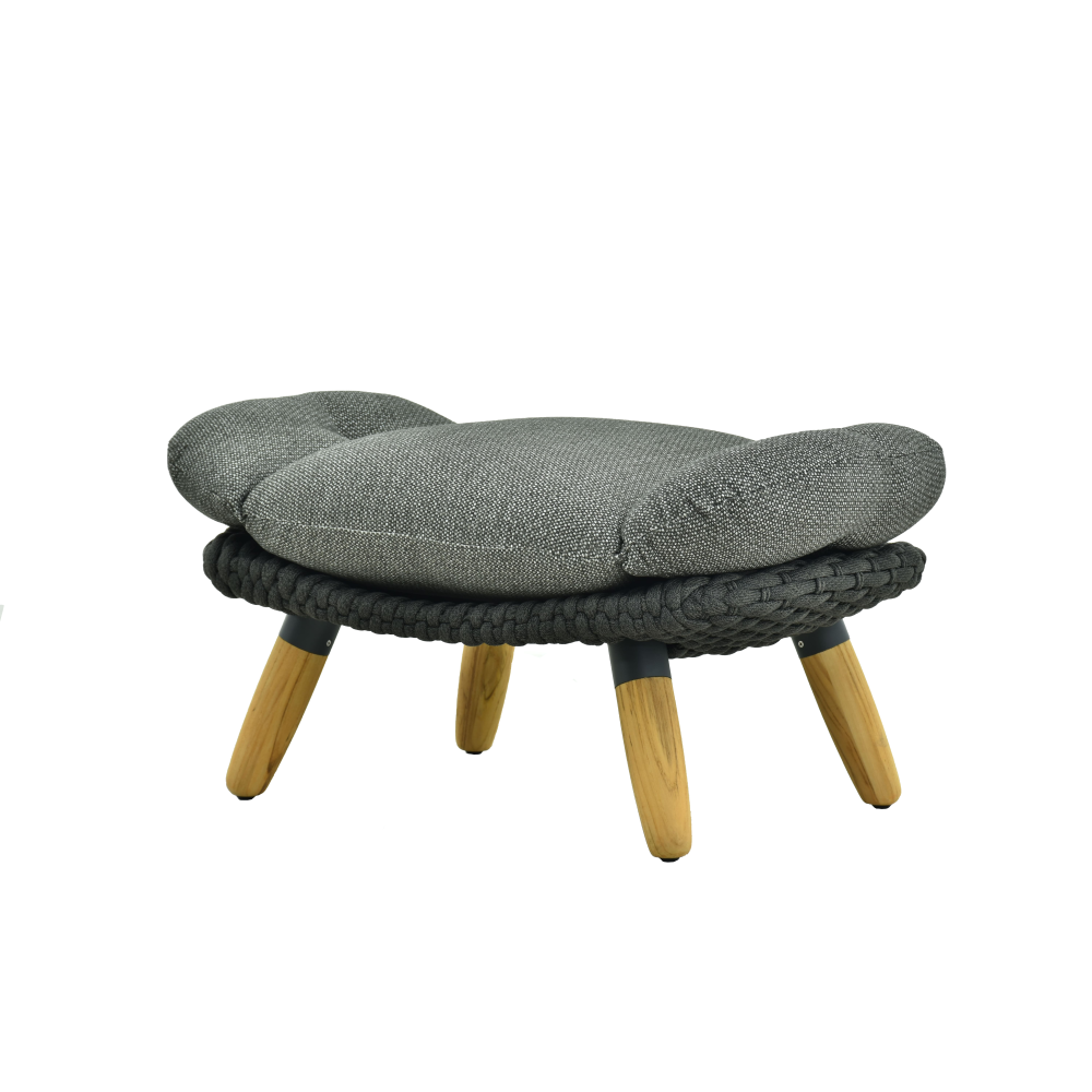 Sunproof® upholstery fabric guarantees resistance to fading and moisture, while natural teak wood details introduce warmth and coziness, balancing the coolness of metal.
