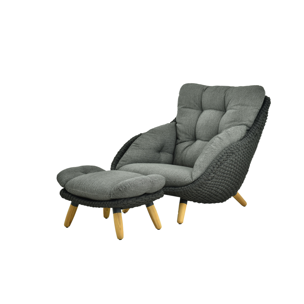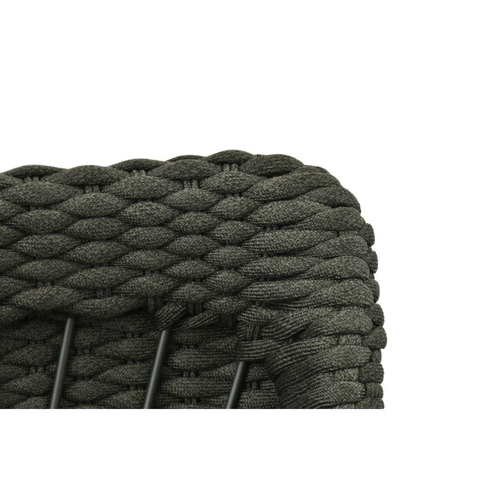 The solid yet visually lightweight construction is made of powder-coated aluminum, ensuring durability, corrosion resistance, and UV protection. The acrylic rope woven backrest adds a distinct graphic character and comfortable support.