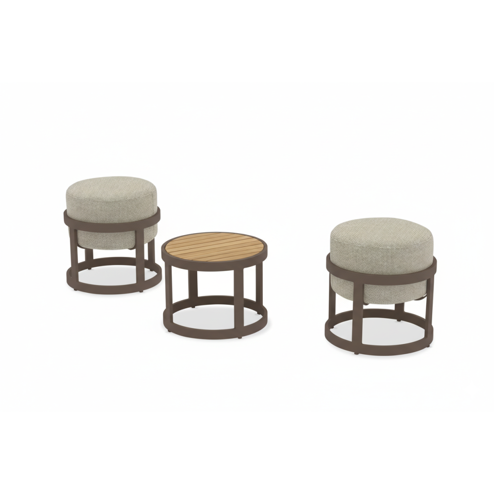 Modular lounge set for a terrace or balcony. The set includes 2 ottomans and a table with a teak wood top and an aluminum frameThe table and ottomans can be stacked on top of each other.