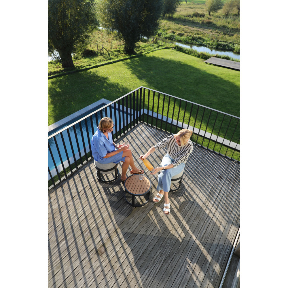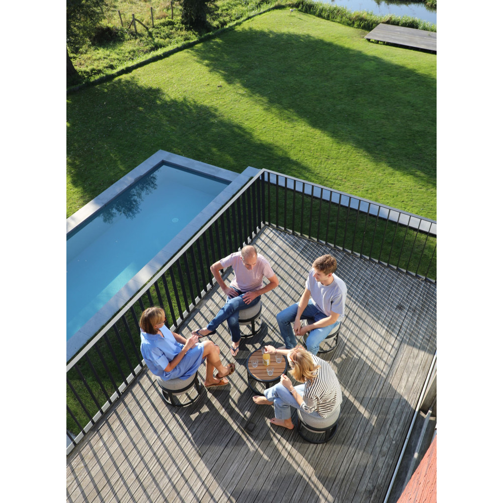 Modular lounge set for a terrace or balcony. The set includes 2 ottomans and a table with a teak wood top and an aluminum frame. The table and ottomans can be stacked on top of each other.